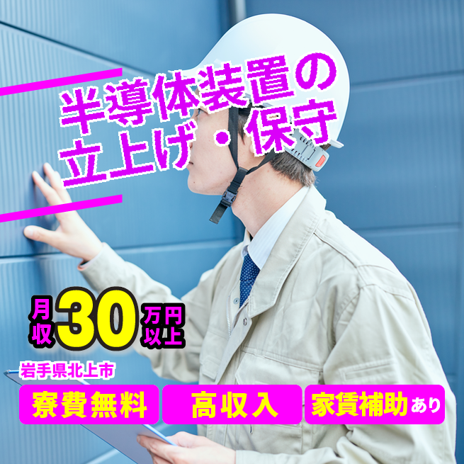 給与詳細 月収例 309,150円 時給例 1,656円 勤務地 岩手県北上市 仕事内容 ラムリサーチ社の半導体装置の立ち上げや、改造、トラブル対応や設備保守・保全業務。半導体業務に付随する業務。