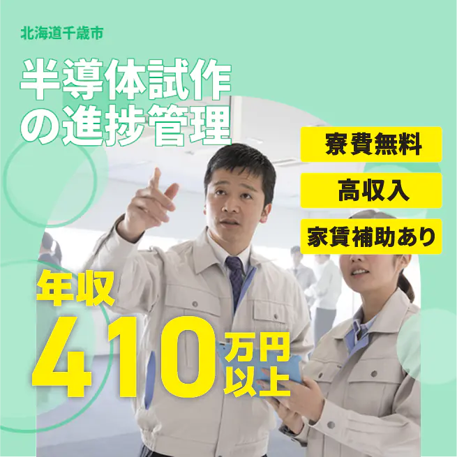 給与詳細 年収例 4,180,800円 月収例 348,400円 勤務地 北海道千歳市 仕事内容 半導体試作製品のオペレーション・進捗管理をメインとしている仕事です。