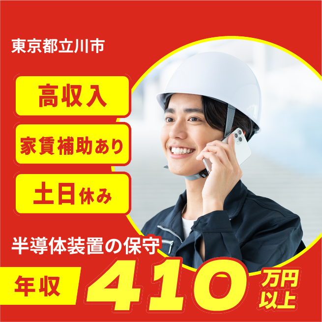 給与詳細 年収例 4,189,032円 月収例 349,086円 勤務地 東京都立川市 仕事内容 半導体製造装置のフィールドエンジニア業務全般。エンドユーザーへの据付。保守保全。