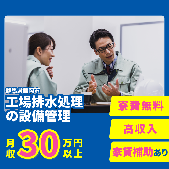 給与詳細 月収例 301,500円 時給例 1,687円 勤務地 群馬県藤岡市 仕事内容 【工場排水処理設備管理業務】