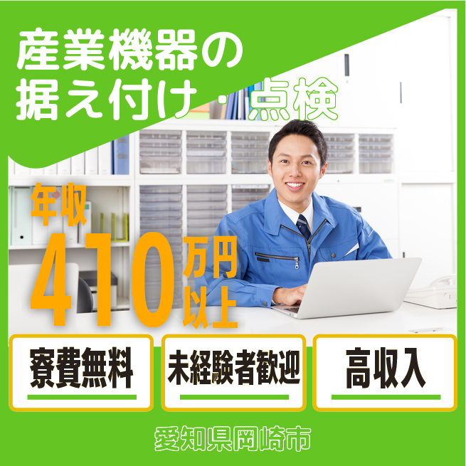給与詳細 年収例 4,179,720円 月収例 348,310円 勤務地 愛知県岡崎市 仕事内容 ①納品先企業様へ出張(国内・海外)し、製品の据え付け・点検を行う業務。
