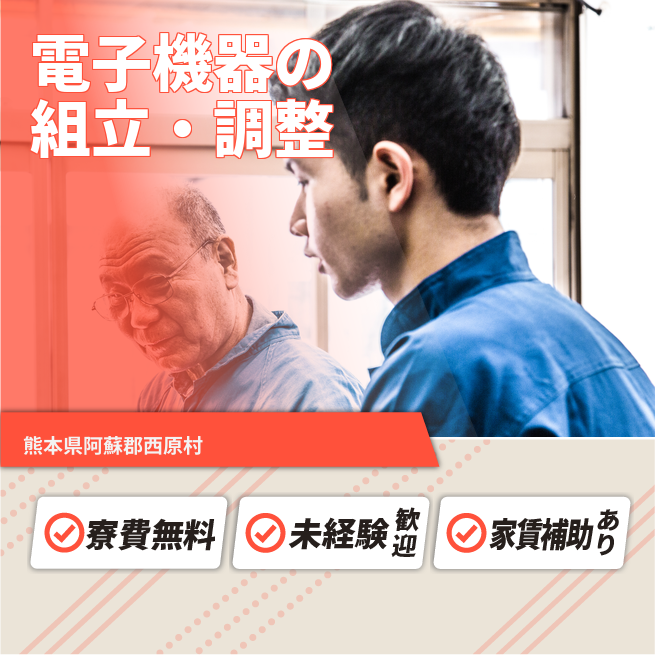給与詳細 月収例 213,750円 時給例 1,125円 勤務地 熊本県阿蘇郡西原村 仕事内容 マスフローコントローラーと言う手のひらサイズの電子機器製品の製造を行います。