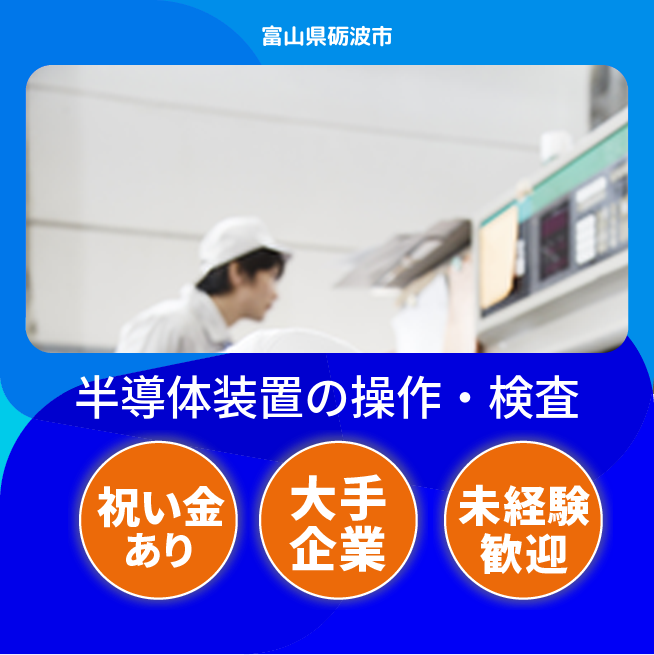 給与詳細 月収例 253,257円 日給例 10,000円 勤務地 富山県砺波市 仕事内容 半導体(ウエーハ)の成膜やエッチング、リソや洗浄といった半導体装置のオペレーター、検査業務