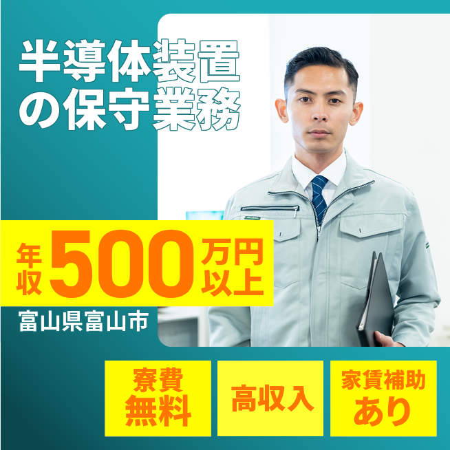 給与詳細 年収例 5,031,600円 月収例 419,300円 勤務地 富山県富山市 仕事内容 【国内出張先での半導体製造装置に関わるアフターサービス業務】