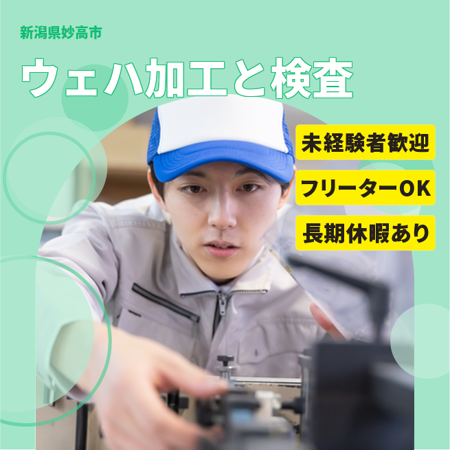 給与詳細 月収例 220,174円 日給例 10,000円 勤務地 新潟県妙高市 仕事内容 ウェハ加工マシンオペレーター