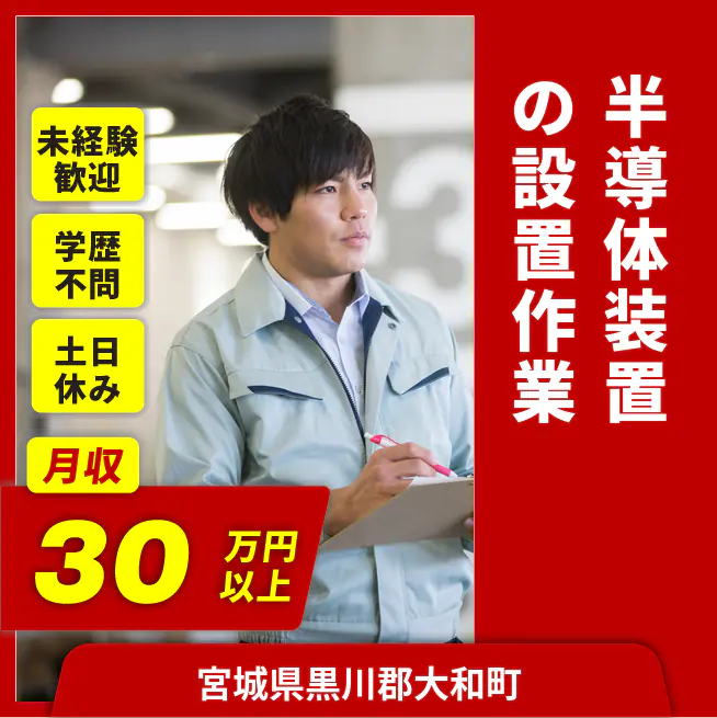 給与詳細 例 0円 日給例 10,400円 勤務地 宮城県黒川郡大和町 仕事内容 半導体工場で使用される半導体製造装置の「設置業務」を国内の半導体工場に出張し、チームにて作業を行います。