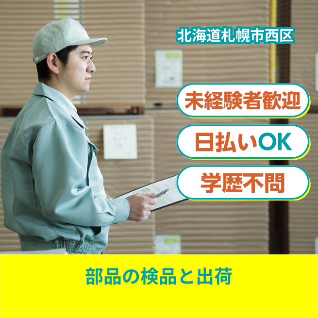 ※実際と異なるケースもございます。 交通費 支給あり 応募の流れ 本ページ内<応募する>ボタンより、必要項目をご入力の上、ご応募ください。 勤務地 【勤務地】北海道札幌市西区発寒12条14丁目 勤務時間 【勤務地】08:30~17:15 休憩60分