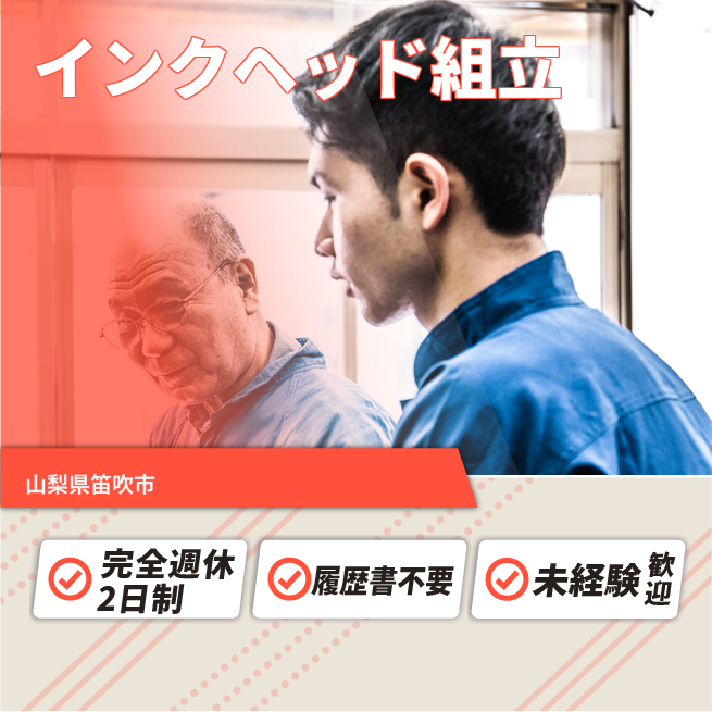 給与詳細 月収例 201,666円 日給例 10,083円 勤務地 山梨県笛吹市 仕事内容 インクジェットヘッドの組立作業