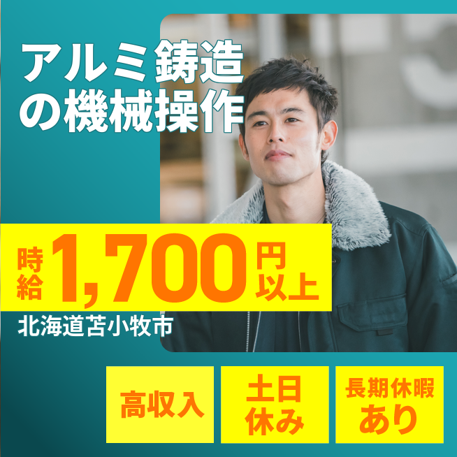 給与詳細 月収例 280,000円 時給例 1,750円 勤務地 北海道苫小牧市 仕事内容 ウィルオブ・ワークの正社員として取引先のアルミ鋳造工場で勤務いただきます。