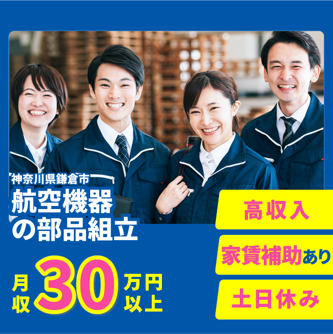 給与詳細 月収例 300,000円 時給例 1,875円 勤務地 神奈川県鎌倉市 仕事内容 ウィルオブ・ワークの正社員として取引先の航空・宇宙機器製造工場にてご勤務いただきます。