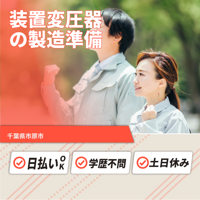 給与詳細 月収例 250,180円 日給例 11,200円 勤務地 千葉県市原市 仕事内容 ■開閉装置・変圧器の製造準備(ピッキング、運搬作業)