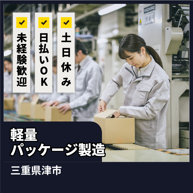 給与詳細 月収例 280,000円 日給例 10,000円 勤務地 三重県津市 仕事内容 【軽量パッケージの製造】