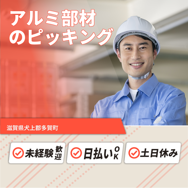 給与詳細 月収例 240,000円 日給例 10,160円 勤務地 滋賀県犬上郡多賀町 仕事内容 【アルミ部材のピッキング】