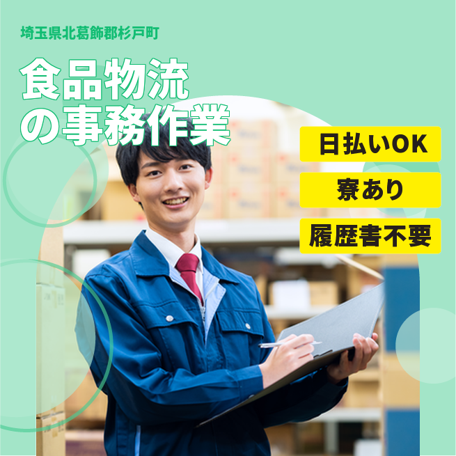 給与詳細 月収例 251,228円 日給例 10,320円 勤務地 埼玉県北葛飾郡杉戸町 仕事内容 【食品物流センターの一般事務兼倉庫内作業】