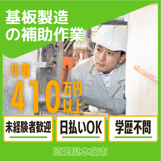 給与詳細 年収例 4,104,000円 月収例 342,000円 勤務地 埼玉県本庄市 仕事内容 【電子基板日勤専属の製造補助】