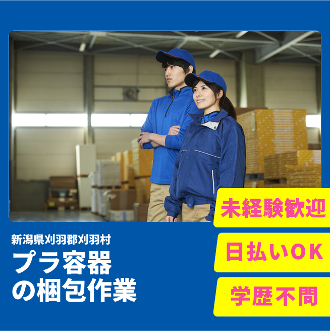給与詳細 月収例 228,360円 時給例 1,200円 勤務地 新潟県刈羽郡刈羽村 仕事内容 【プラスチック容器の梱包】