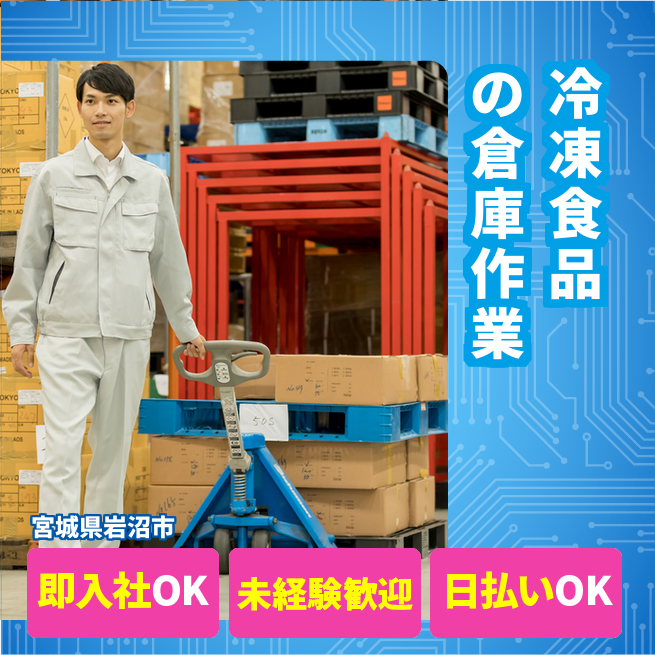 給与詳細 月収例 212,740円 時給例 1,180円 勤務地 宮城県岩沼市 仕事内容 【冷凍食品のピッキング/日勤】