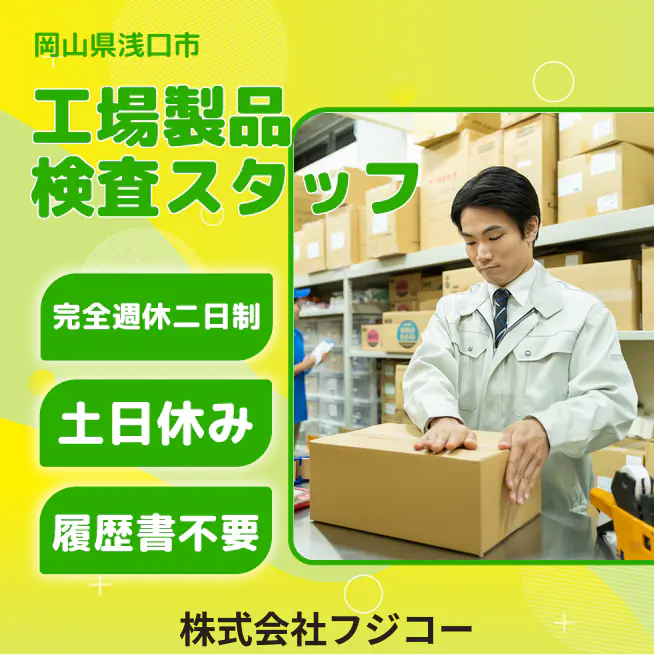 企業 株式会社フジコー 給与詳細 月収例 175,000円 時給例 1,094円 勤務地 岡山県浅口市 仕事内容 【業務概要】