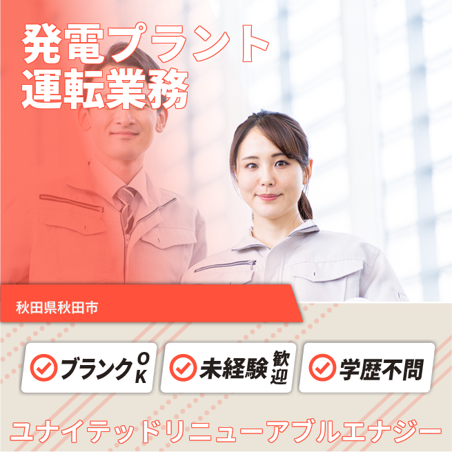 企業 ユナイテッドリニューアブルエナジー株式会社 給与詳細 月収例 180,000円 時給例 1,125円 勤務地 秋田県秋田市 仕事内容 バイオマス発電プラントの運転業務に従事いただきます。