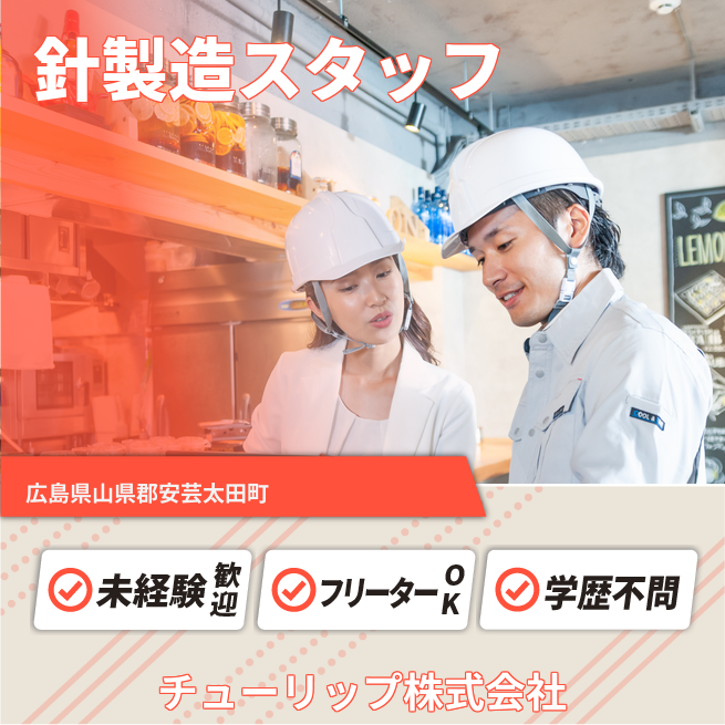 企業 チューリップ株式会社 給与詳細 月収例 180,000円 時給例 1,125円 勤務地 広島県山県郡安芸太田町 仕事内容 電子製品に使用される針の、製造や検品などをお願いします。