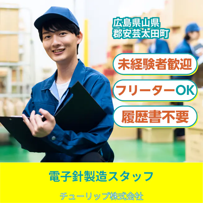 企業 チューリップ株式会社 給与詳細 月収例 180,000円 時給例 1,125円 勤務地 広島県山県郡安芸太田町 仕事内容 手芸用の針や電子製品に使用される針の製造や検品などをお願いします。