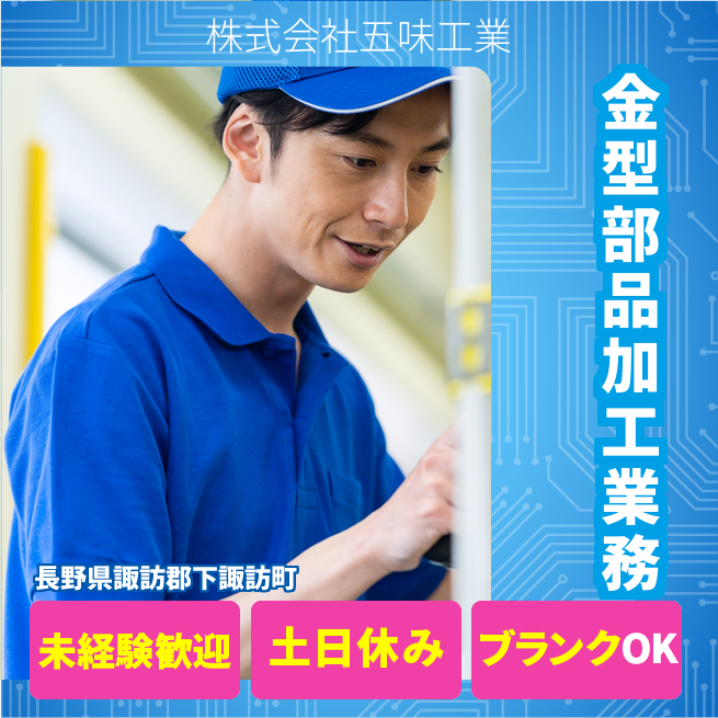 企業 株式会社五味工業 給与詳細 月収例 180,000円 時給例 1,125円 勤務地 長野県諏訪郡下諏訪町 仕事内容 金属加工スタッフとして機械部品の製造に携わっていただきます★