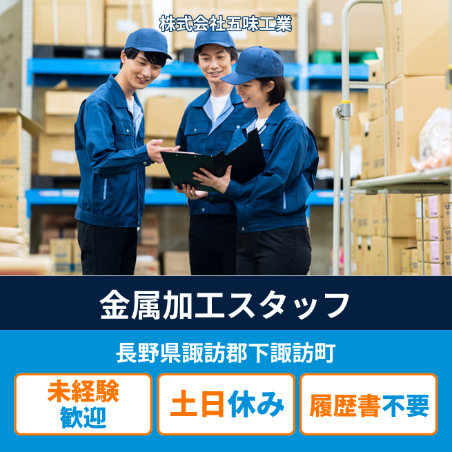 企業 株式会社五味工業 給与詳細 月収例 180,000円 時給例 1,125円 勤務地 長野県諏訪郡下諏訪町 仕事内容 「金属加工の世界で手に職をつけたい。」「未経験だけど丁寧にサポートしてほしい。」「女性が腰を据えて学べる製造現場を探している。」