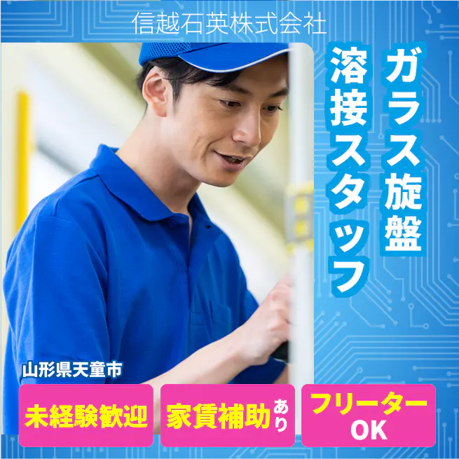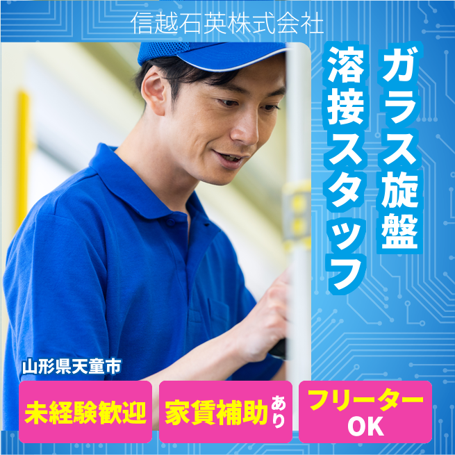 企業 信越石英株式会社 給与詳細 月収例 177,750円 時給例 1,111円 勤務地 山形県天童市 仕事内容 ガラス旋盤やガスバーナーを用いた溶接業務をお任せします。