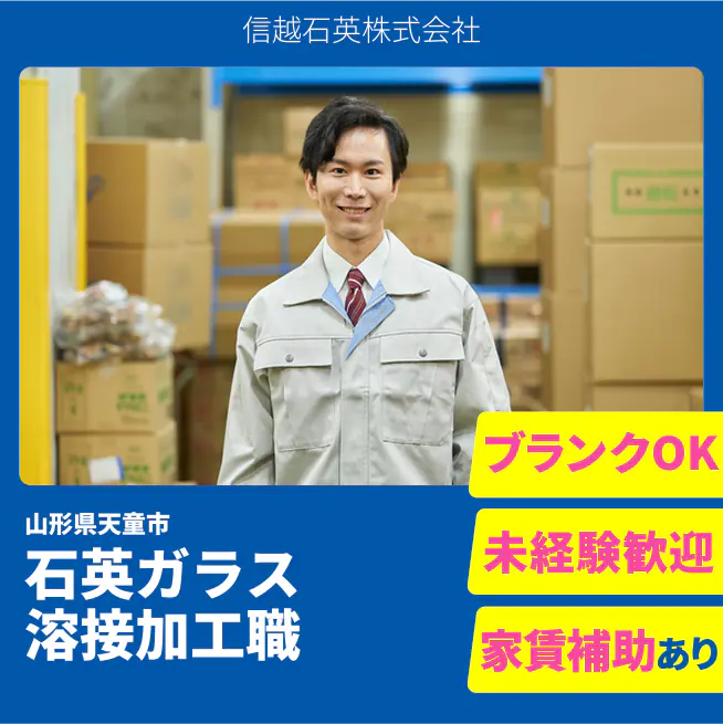 企業 信越石英株式会社 給与詳細 月収例 177,750円 時給例 1,111円 勤務地 山形県天童市 仕事内容 半導体製造工程に用いられる高純度石英ガラス製品を酸水素火炎バ-ナ-や機械装置を使用しての溶接加工作業をお任せします。