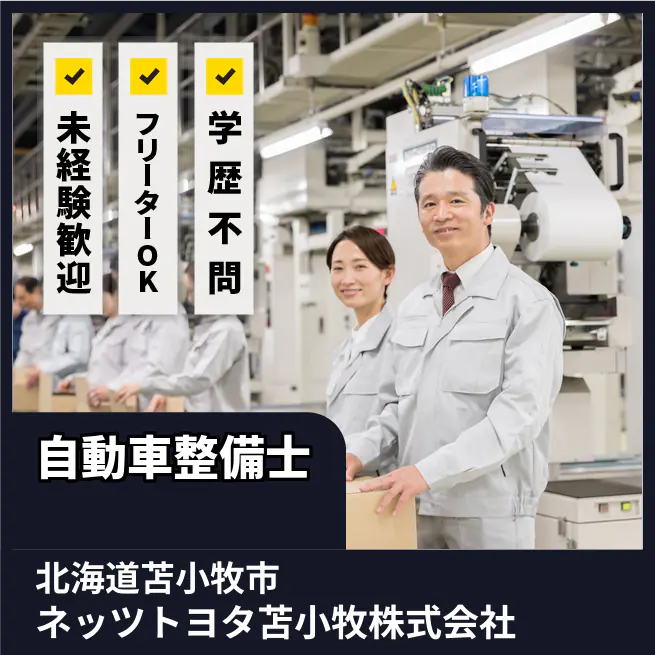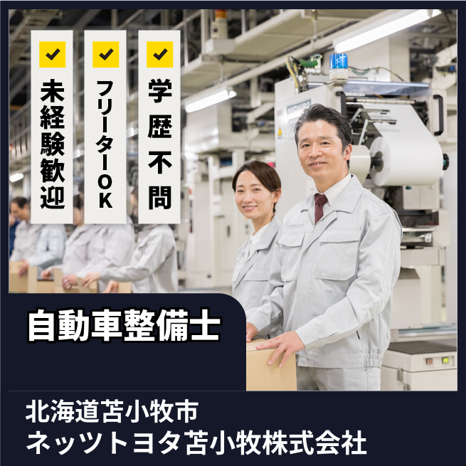 企業 ネッツトヨタ苫小牧株式会社 給与詳細 月収例 165,000円 時給例 1,031円 勤務地 北海道苫小牧市 仕事内容 「自動車整備士として未経験から始める第一歩」