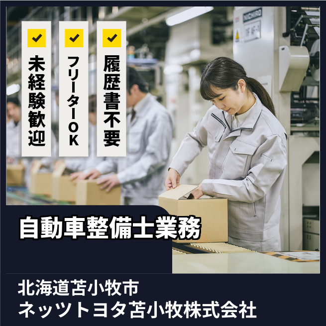 会社負担のトヨタ独自の資格・教育制度があり、入社後資格取得が可能です。また、フロントや営業等へのキャリアチェンジも可能です。 求人番号 1898-2h 給与詳細 月収例 165,000円 時給例 1,031円 応募の流れ 本ページ内<応募する>ボタンより、必要項目をご入力の上、ご応募ください。 勤務地 【勤務地】北海道苫小牧市小糸井町1丁目5番20号 勤務時間 【勤務地】09:15~18:00(実働7時間45分、休憩 60分)