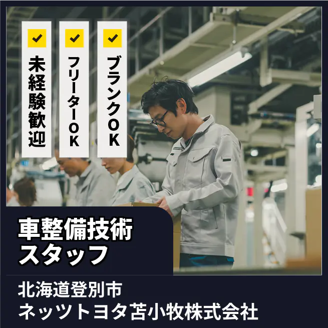 企業 ネッツトヨタ苫小牧株式会社 給与詳細 月収例 165,000円 時給例 1,031円 勤務地 北海道登別市 仕事内容 「やっぱりトヨタ車に魅力を感じていて、整備で携わりたい。」