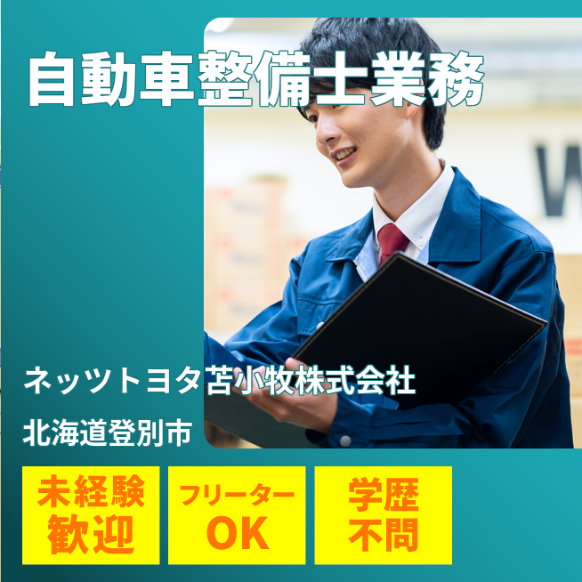 会社負担のトヨタ独自の資格・教育制度があり、入社後資格取得が可能です。また、フロントや営業等へのキャリアチェンジも可能です。 企業名 ネッツトヨタ苫小牧株式会社契約社員求人
