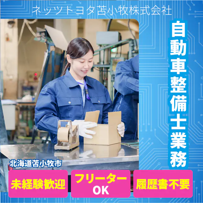 企業 ネッツトヨタ苫小牧株式会社 給与詳細 月収例 165,000円 時給例 1,031円 勤務地 北海道苫小牧市 仕事内容 「未経験OK!車を通じて安全と快適を届ける整備士に」