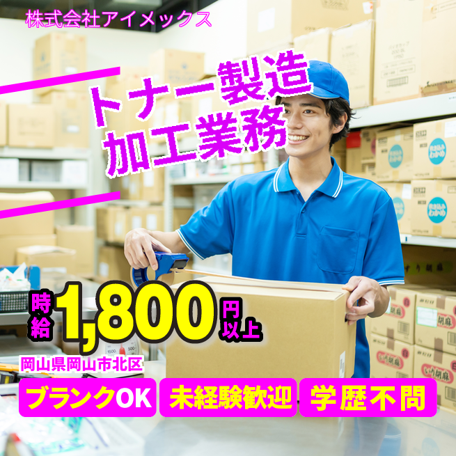 企業 株式会社アイメックス 給与詳細 月収例 288,000円 時給例 1,800円 勤務地 岡山県岡山市北区 仕事内容 トナー事業における生産設備のオペレーション業務をお任せします!