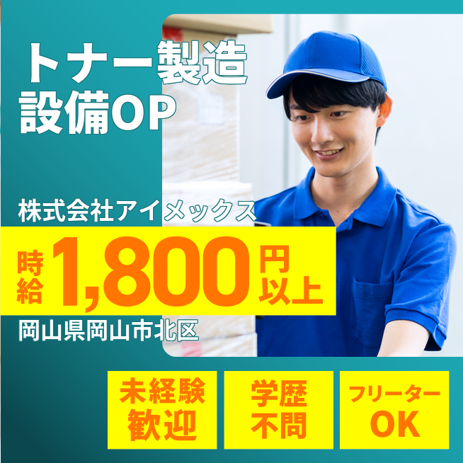企業 株式会社アイメックス 給与詳細 月収例 288,000円 時給例 1,800円 勤務地 岡山県岡山市北区 仕事内容 生産設備のオペレーション担当として、トナー製造に携わっていただきます★