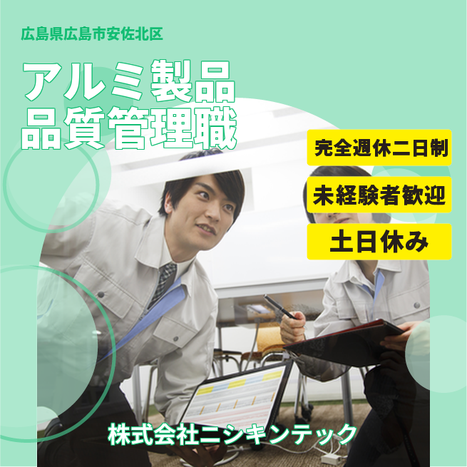 当社製品は広島県内ではトップシェア、その他大阪・福岡・栃木へも営業所を展開しております。高い品質と顧客ニーズに併せてフレキシブルに対応できる事に評価をいただいております。自分が携わった製品をマンションなど街中で目にした時は非常にやりがいを感じる事が出来ます。 企業名 株式会社ニシキンテック正社員求人