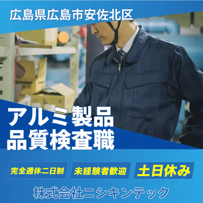 企業 株式会社ニシキンテック 給与詳細 月収例 187,500円 時給例 1,172円 勤務地 広島県広島市安佐北区 仕事内容 品質保証として、検査から検査内容報告までの業務をお任せいたします!