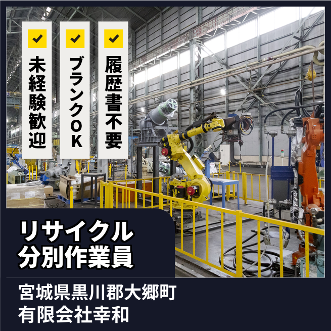 企業 有限会社幸和 給与詳細 月収例 140,000円 時給例 875円 勤務地 宮城県黒川郡大郷町 仕事内容 「環境を守るリサイクル作業にチャレンジ!」