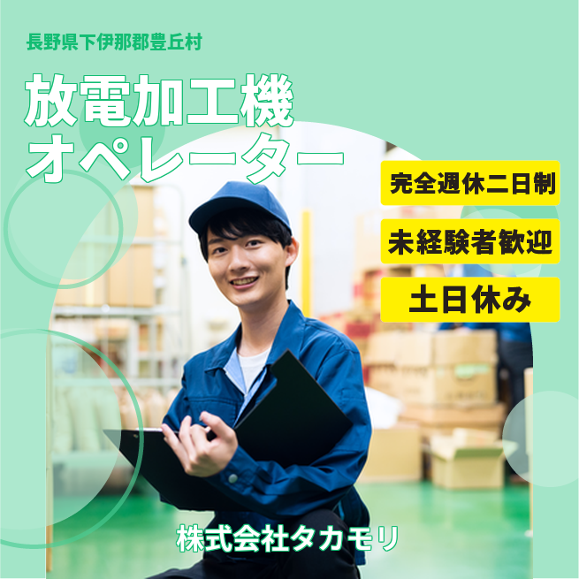 企業 株式会社タカモリ 給与詳細 月収例 200,000円 時給例 1,250円 勤務地 長野県下伊那郡豊丘村 仕事内容 ワイヤー放電加工機を操作して、主に開発段階のモータコアを作成していただきます。