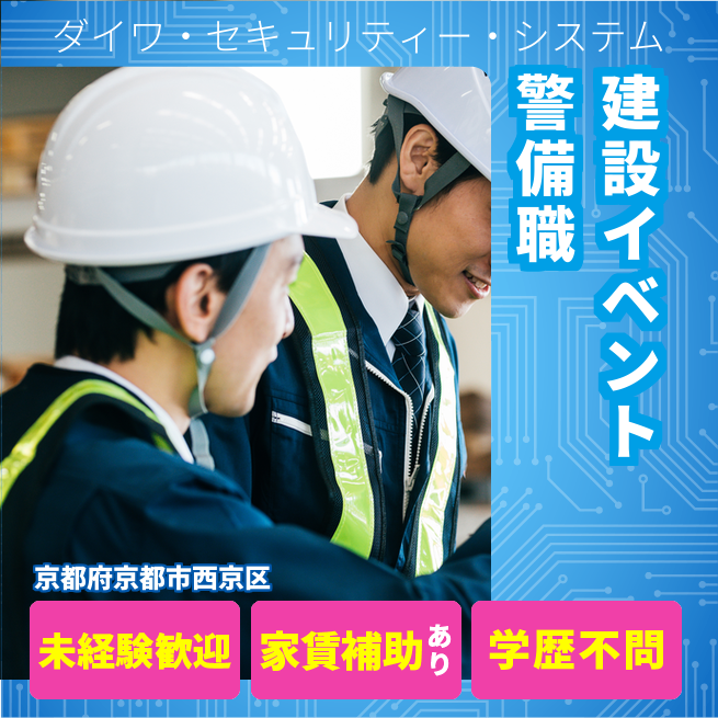 企業 株式会社ダイワ・セキュリティー・システム 給与詳細 月収例 250,000円 時給例 1,563円 勤務地 京都府京都市西京区 仕事内容 警備業務を取り扱う当社にて、建設現場や工事現場、イベント等の警備業務を行っていただきます。