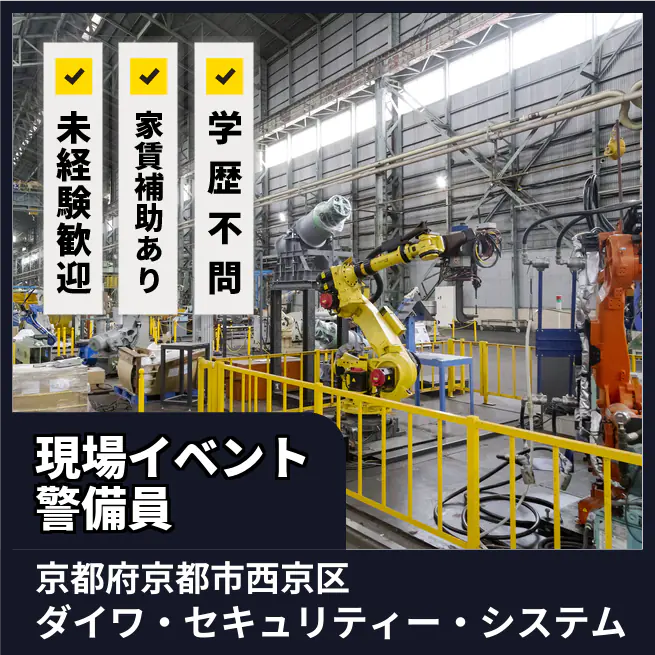企業 株式会社ダイワ・セキュリティー・システム 給与詳細 月収例 250,000円 時給例 1,563円 勤務地 京都府京都市西京区 仕事内容 警備会社にて、工事現場での誘導やイベント会場内での警備などをお願いします。