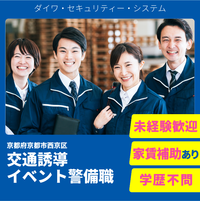 企業 株式会社ダイワ・セキュリティー・システム 給与詳細 月収例 250,000円 時給例 1,563円 勤務地 京都府京都市西京区 仕事内容 人が大勢集まる場所で事故が起きぬよう雑踏警備や交通誘導などを行っていただきます。