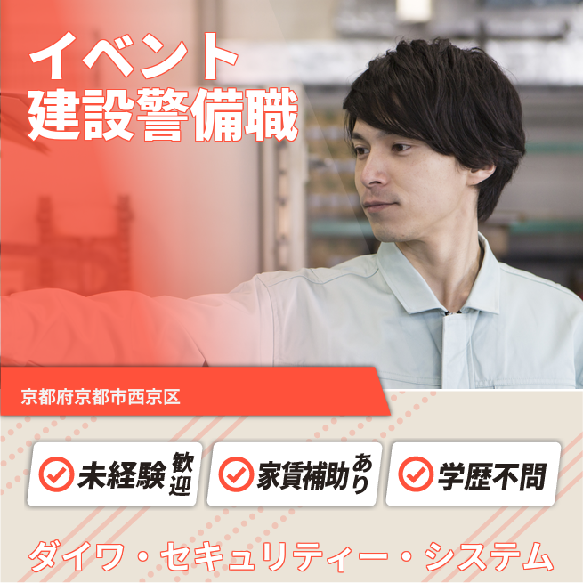 企業 株式会社ダイワ・セキュリティー・システム 給与詳細 月収例 250,000円 時給例 1,563円 勤務地 京都府京都市西京区 仕事内容 「京都の安全を守る!未経験から始める警備スタッフ」