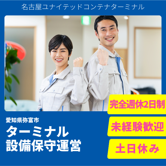 企業 名古屋ユナイテッドコンテナターミナル株式会社 給与詳細 月収例 206,000円 時給例 1,288円 勤務地 愛知県弥富市 仕事内容 名古屋港のコンテナターミナルを運営する企業にて、各種設備等の保守・点検、修理手配などをお任せします。