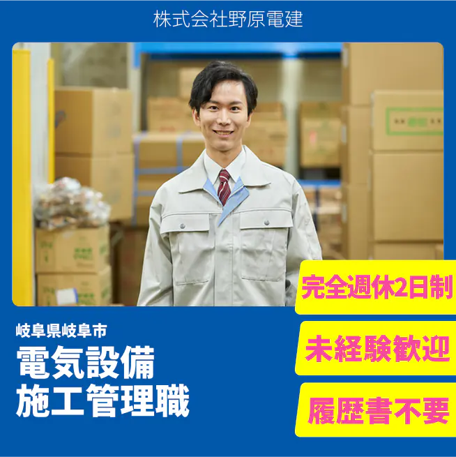 企業 株式会社野原電建 給与詳細 月収例 168,000円 時給例 1,050円 勤務地 岐阜県岐阜市 仕事内容 オフィスや社会インフラ施設等、電気設備の施工管理の仕事をお任せします!