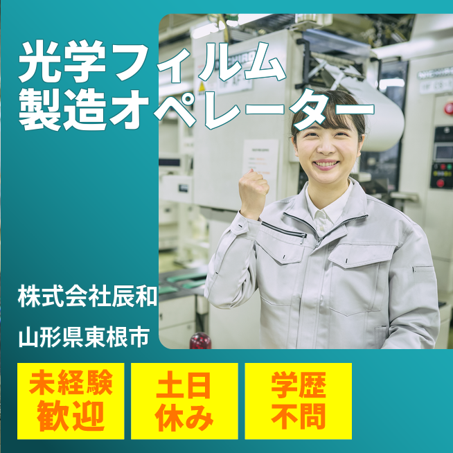 企業 株式会社辰和 給与詳細 月収例 170,000円 時給例 1,063円 勤務地 山形県東根市 仕事内容 機械操作により、光学フィルム製品を加工していただきます。