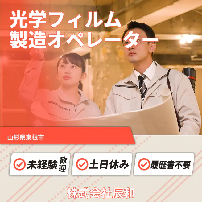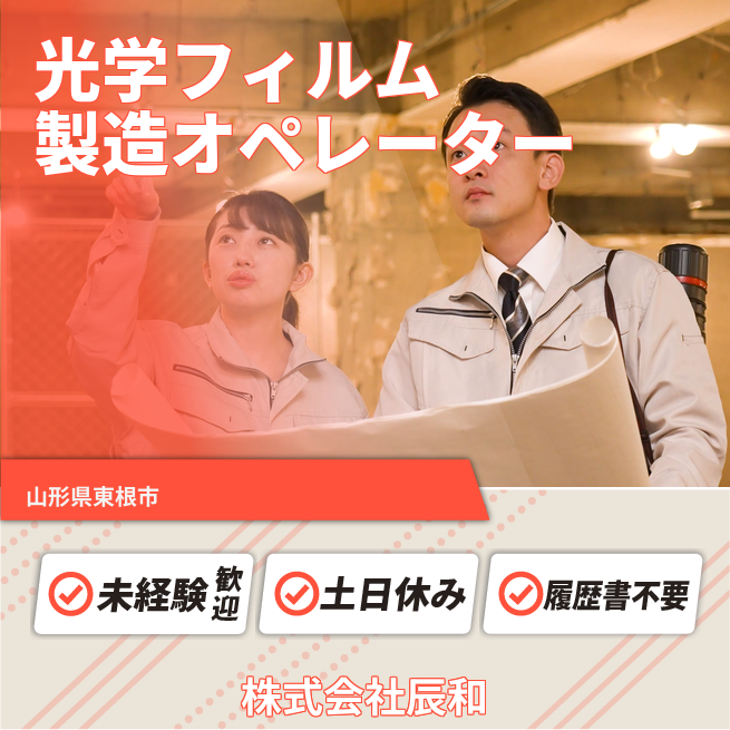 企業 株式会社辰和 給与詳細 月収例 170,000円 時給例 1,063円 勤務地 山形県東根市 仕事内容 フィルム加工でモノづくりの楽しさを実感