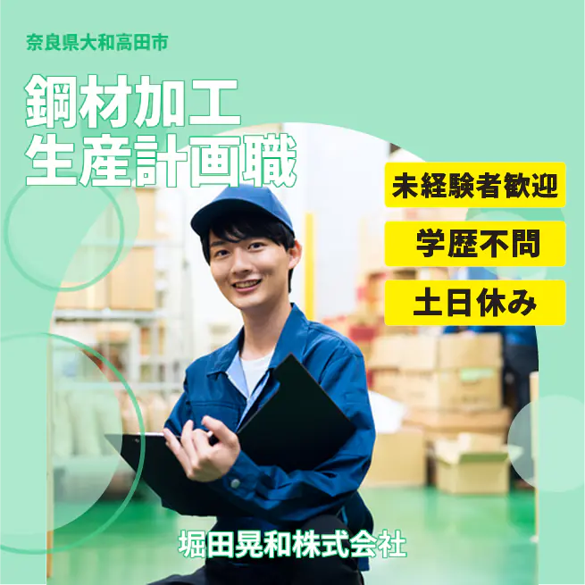 企業 堀田晃和株式会社 給与詳細 月収例 201,000円 時給例 1,256円 勤務地 奈良県大和高田市 仕事内容 「機械操作やモノづくりにワクワクする。」