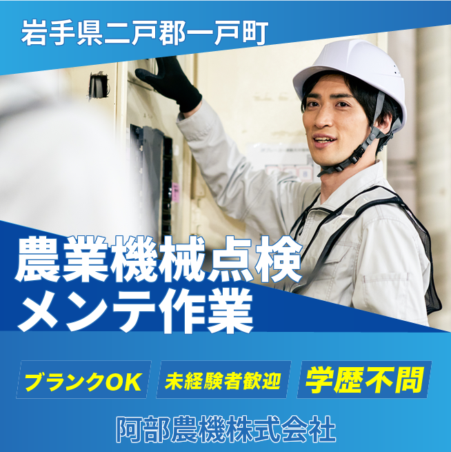 企業 阿部農機株式会社 給与詳細 月収例 172,000円 時給例 1,075円 勤務地 岩手県二戸郡一戸町 仕事内容 農業機械の点検整備や、トラクター・田植機・チェンソーなどの小物商品のメンテナンスなどを担当いただきます。